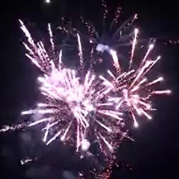Красная звезда разрывается красными ниспадающими звездами с золотым шлейфом.