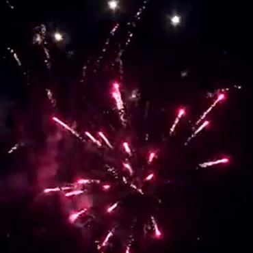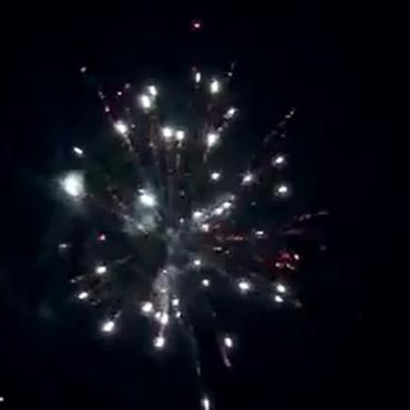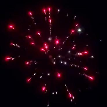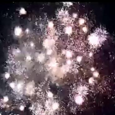 Залп серебряных трещащих, мерцающих комет разрывается красными и зелеными звездами с золотыми хвостами, с переходм в белые трещащие звезды.