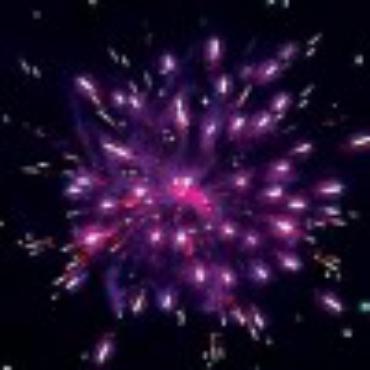 Золотистые кометы с красным мерцающим шлейфом разрываются фиолетовыми и красными мерцающими звездами.
