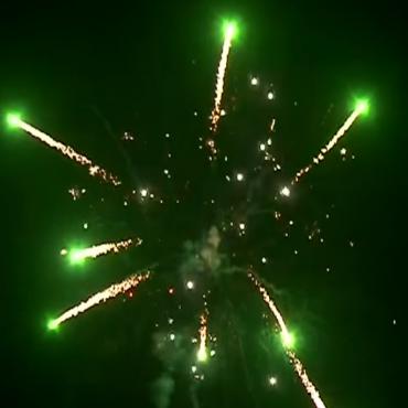 Зеленая звезда разрывается зелеными звездами с пышными золотыми хвостами и трещащими звездами.