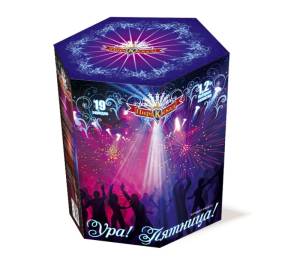 Цветные короны с переходом цвета в синий; золотые мерцающие ивы с синими георгинами; трещащие ивы с синими георгинами; золотые королевские волны с красными звездами; финал: золотые вращающиеся кометы раскрываются эффектом тысяча хризантем с красными георгинами.