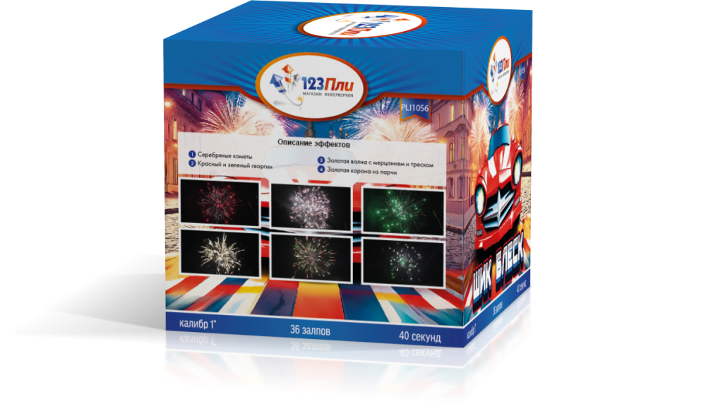 С первых залпов "Шик и Блеск" наполняет небо яркими, сверкающими огнями, которые словно драгоценные камни рассыпаются по черному бархату ночи. Залпы сопровождаются изысканными эффектами — от блестящих искр до эффектных разрывов, создающих потрясающие цветочные формы. Каждый элемент этой батареи продуман до мелочей, чтобы подарить зрителям настоящую феерию света и цвета.
