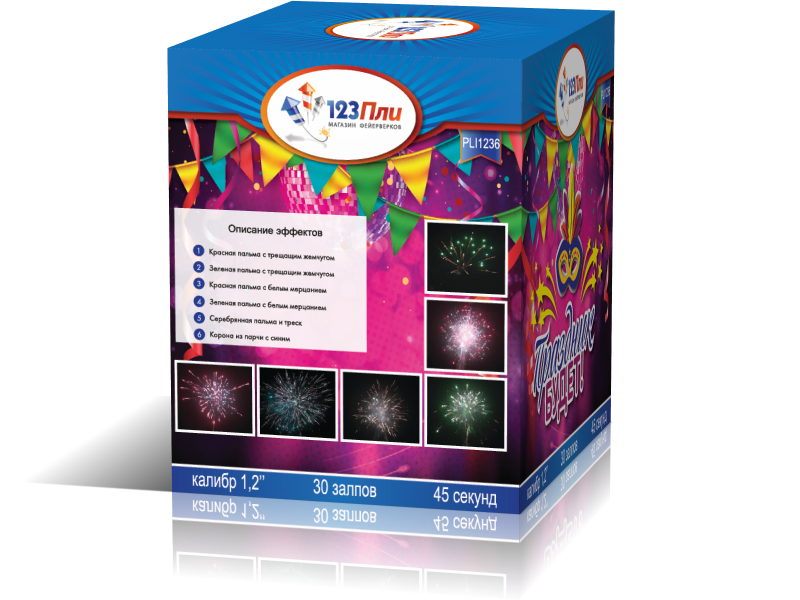 Эта батарея салютов по своему уникальна. 30 ярких залпов готовы радовать вас и ваших гостей своими красками и разнообразием. Красные пальмы распускаются с громким трещащим жемчугом, вслед за ней следует зеленая пальма. Серебряная пальма переходит в синюю корону из парчи!