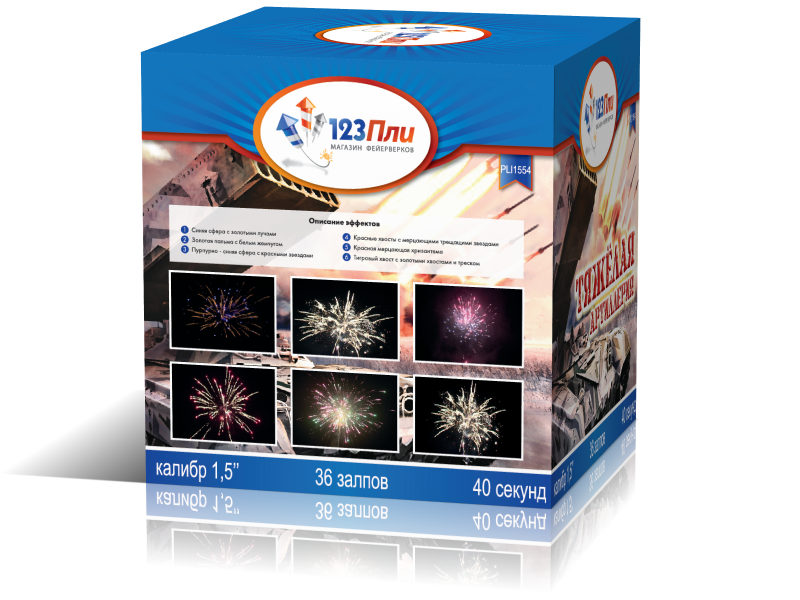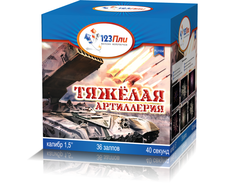Батальоны просят огня... Фейерверк "Тяжелая артиллерия" заявляет о себе не менее громогласно, чем целый танковый батальон, идущий в атаку! Мощная и разнообразная 36-залповая батарея содержит шесть красочных пиротехнических эффектов, некоторые из них: синие сферы, золотые пальмы, красные звезды, мерцающие хризантемы, тигровые хвосты.