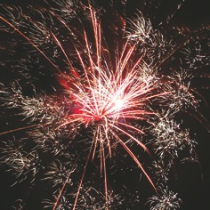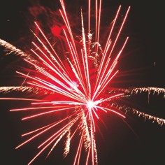 Красная комета разрывается красными звездами с белыми искристыми хвостами и золотым треском.