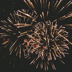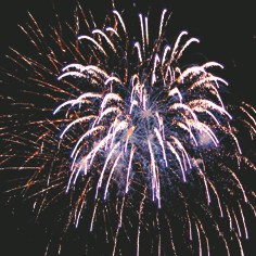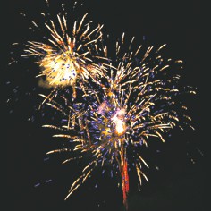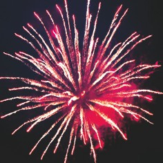 Красные звезды разрываются трещащими золотыми хвостами,розовыми и золотыми звездами, множеством белых искристых хвостов.