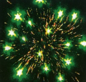 1.Золотые хвосты разрываются синими, оранжевыми звездами и белым мерцанием. 2. Фиолетовые звезды и зеленое мерцание. 3. Красные и зеленые салюты. 4.Мощный серебрянный треск.