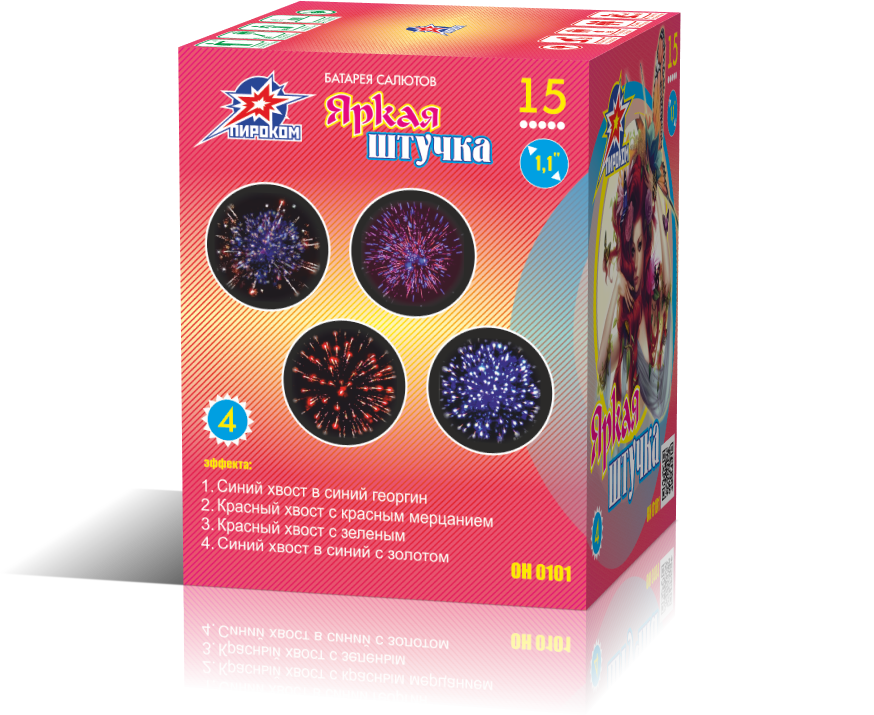Приготовьтесь к взрыву цвета и волнения с нашим фейерверком "Яркая штучка"! Этот уникальный фейерверк на 15 залпов с впечатляющим калибром 1,1 подарит вам незабываемое пиротехническое шоу.