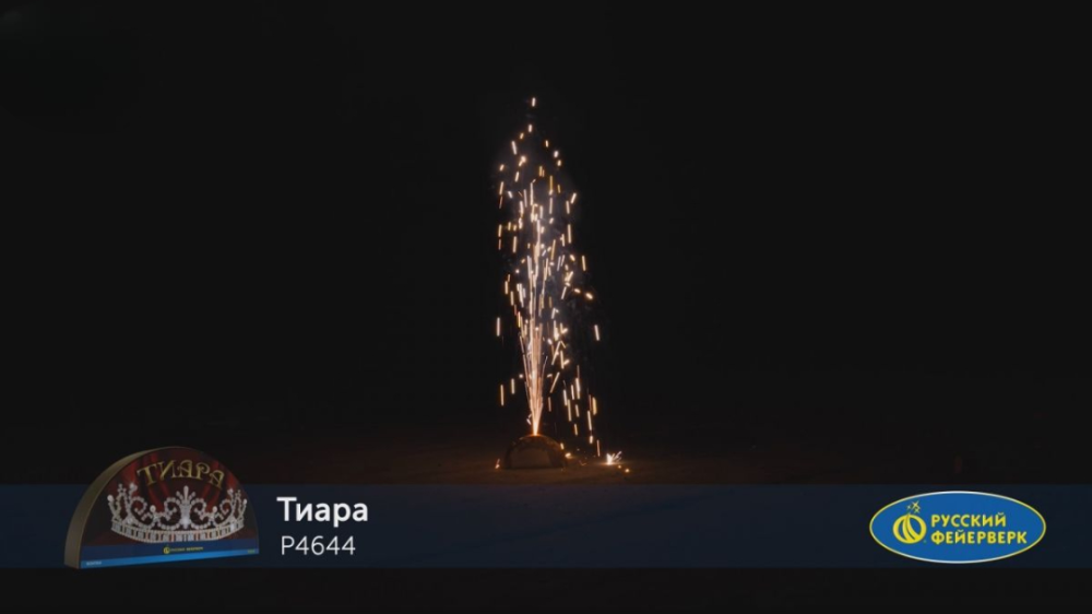Фонтан "Тиара" веерного типа, работает одновременно вверх и в стороны. Мощные, разнообразные эффекты, включая поток серебряных и золотых искр, крупные зеленые и красные жемчужины, трещащие золотые вспышки и листья очень понравятся и детям, и взрослым.