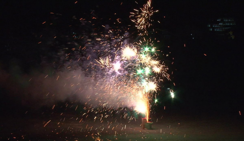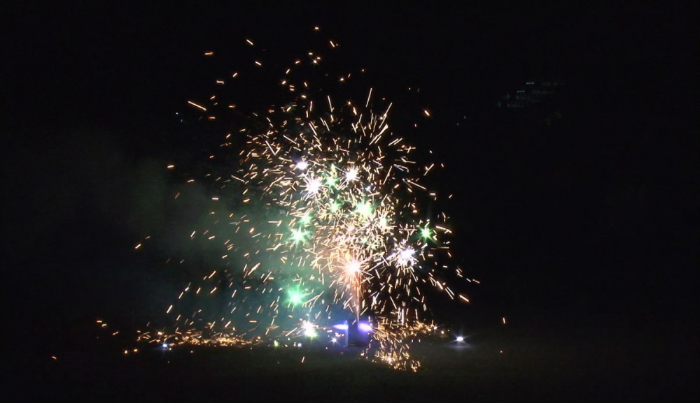 6. Голубые и золотые трещащие огни, на боковых поверхностях начинают работать дополнительные пять фонтанов, фиолетовое пламя в основании и поток золотых огней.