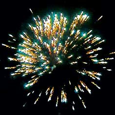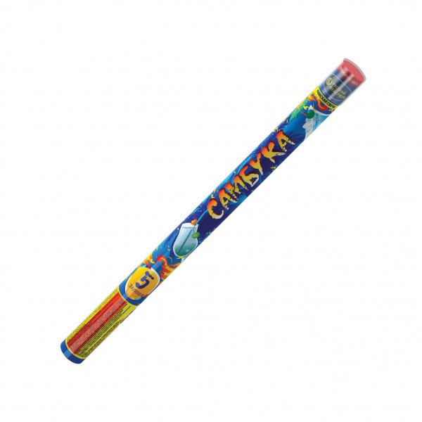 Римская свеча Самбука при выстреле образует сферу из красных звезд и белых мерцающих звезд.